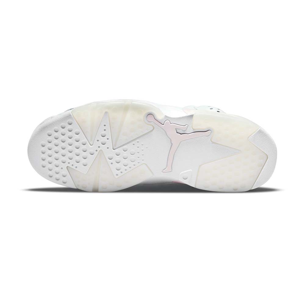 The women’s Air Jordan 6 Retro ‘Gold Hoops’ adds gilded accents to the shoe that Michael Jordan wore when he clinched his first ever NBA championship. The vintage mid-top carries a white tumbled leather upper with Barely Rose hits on the tongue, heel tab and midsole, fitted with a visible Air-sole unit in the heel. Metallic gold lace locks are matched by a trio of earring-inspired gold hoops, with a Jumpman charm attached to the lowest ring via a short gold chain. Underfoot, milky translucent rubber is utilized on the outsole.